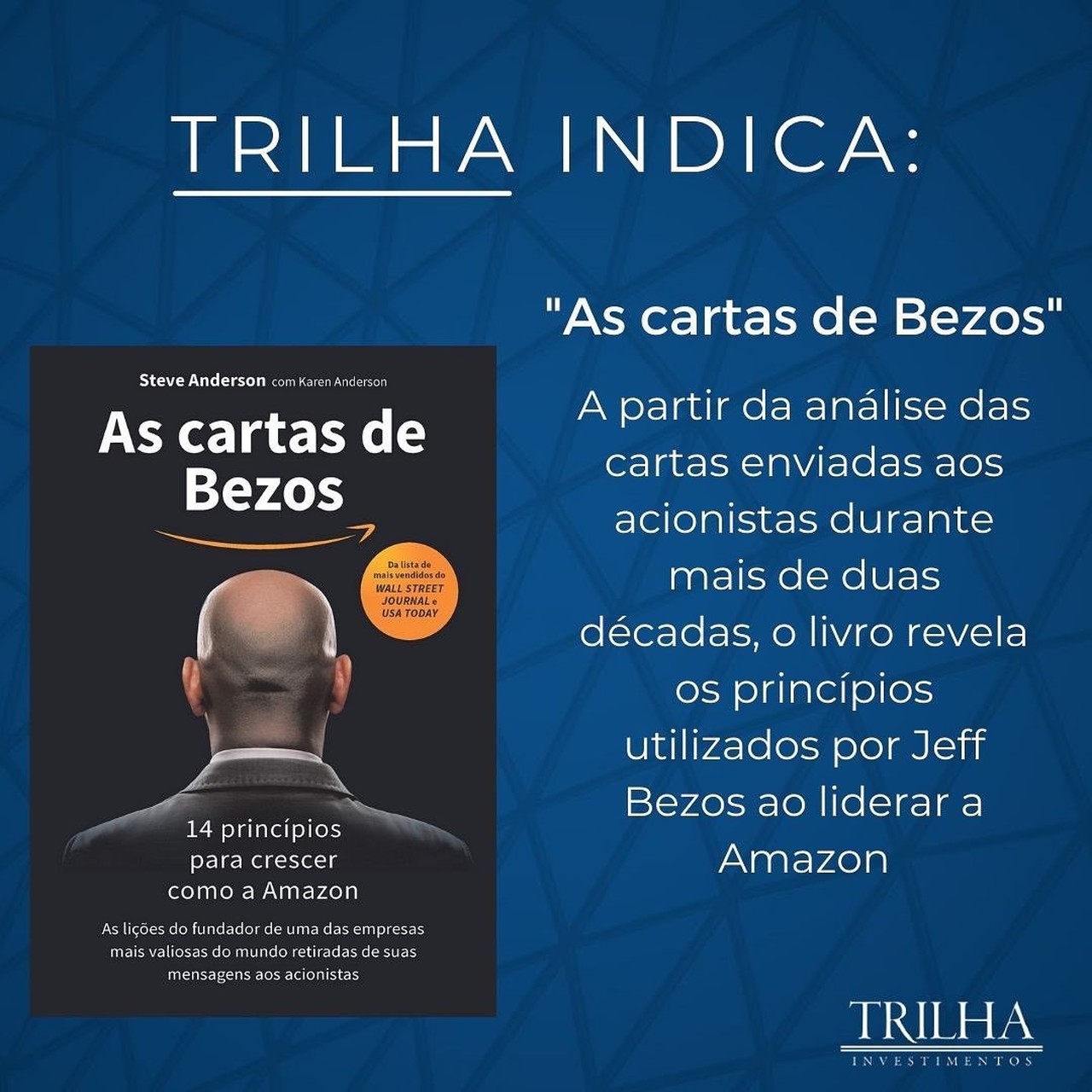No livro “As cartas de Bezos” o autor, Steve Anderson, analisa cada uma das cartas publicadas e disseca os 14 principais princípios que possibilitaram o crescimento da Amazon. Este livro é uma grande lição de estratégia corporativa para todos que desejam entender um pouco do sucesso da empresa e como ele pode ser aplicado em outros negócios.