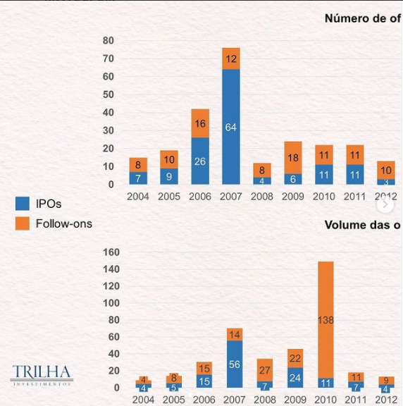 Em relação ao volume de ofertas, o ano de 2010 foi o mais representativo da amostra analisada no estudo. Naquele ano ocorreu um evento (outlier) que foi a mega oferta de ações da Petrobrás, um follow-on que levantou aproximadamente R$120 bilhões, visando a exploração do pré-sal, na época um grande atrativo. Ao desconsiderar este evento outlier, o ano de 2010, não seria tão representativo.