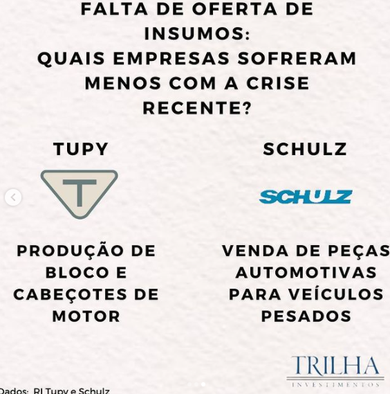 Nesse cenário as montadoras acabaram se prejudicando bastante, porém empresas voltadas aos segmentos mais pesados foram beneficiadas, por exemplo Schulz e Tupy apresentam boas expectativas de resultados movido pela grande demanda por maquinários pesados e caminhões.