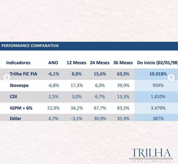 Nele, você pode encontrar as principais informações do TRILHA FIC FIA, bem como os comparativos com os principais indicadores do mercado.