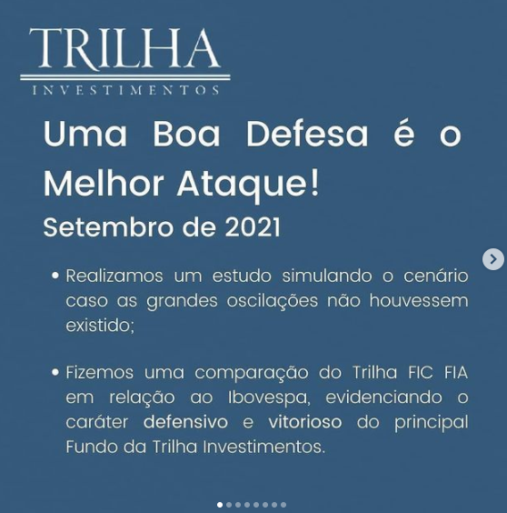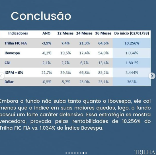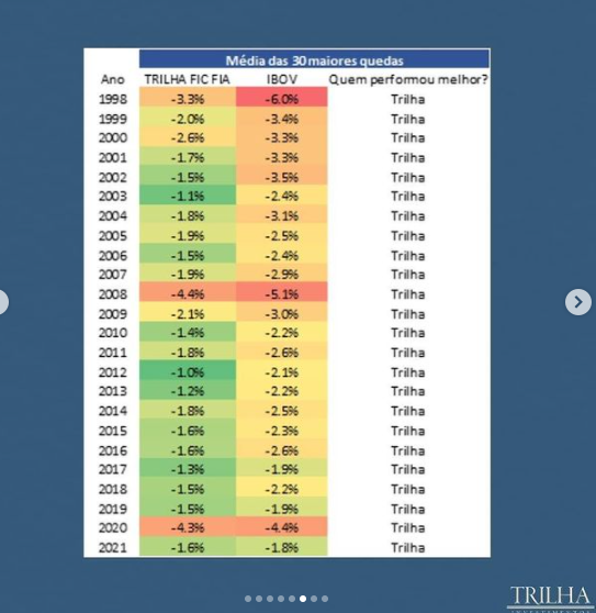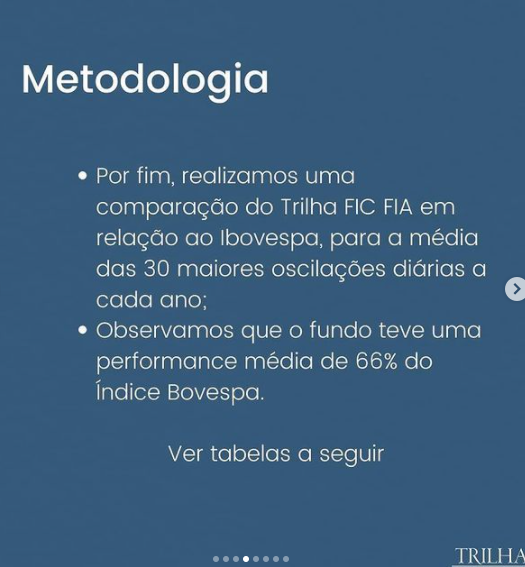 Por fim, realizamos uma comparação do Trilha FIC FIA em relação ao Ibovespa, para a média das 30 maiores oscilações diárias a cada ano. Observamos que o fundo teve uma performance média de 66% do Índice Bovespa, ou seja, embora o fundo não suba tanto quanto o Ibovespa, ele cai menos que o índice em suas maiores quedas, logo, o fundo possui um forte caráter defensivo. Essa estratégia se mostra vencedora, provada pelas rentabilidades de 10.256% do Trilha FIC FIA vs. 1.034% do Índice Bovespa*.