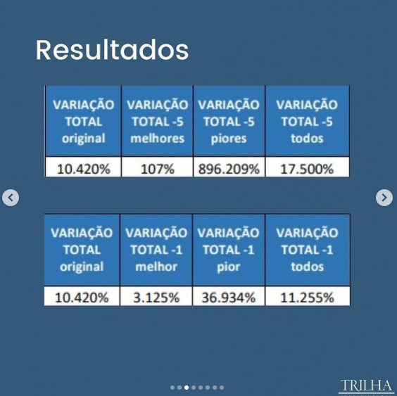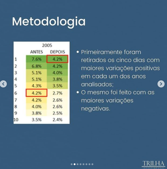 No próximo cenário retirando apenas as maiores oscilações diárias ano a ano, os resultados foram, respectivamente, 3.125%, 36.934% e 11.255%.